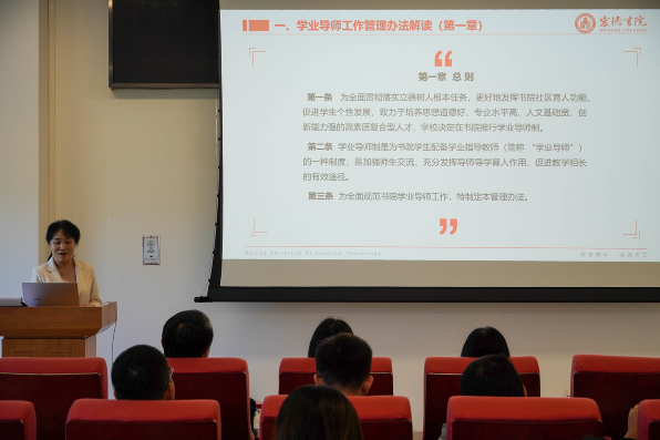 侯虹就《学业导师工作管理办法》及《学业导师工作指南》进行了解读,明确学业导师在学生发展各阶段重点指导内容和要求。侯虹希望学业导师们切实履行工作职责,为学生搭建学科资源和平台,提高学生科研实践能力,同时充分发挥个人的专业特长及人格魅力,通过多种形式的交流,做学生成长成才的守望者和引路人。