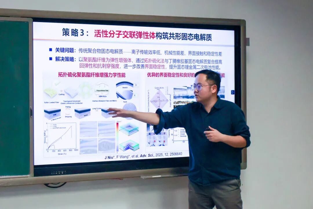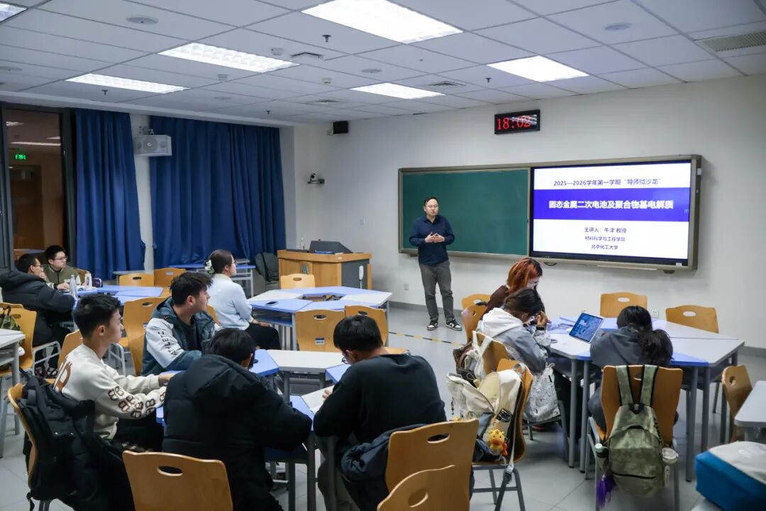 本期导师微沙龙系统介绍了下一代电化学储能技术。活动伊始,牛津教授从“双碳”战略切入,指出现有锂离子电池面临电解液漏液与稳定性不足等挑战,由此,牛老师引出了更具发展潜力的解决方案——固态金属二次电池。牛老师进一步解析了该类电池的核心工作原理与关键技术挑战,重点介绍了固态聚合物基电解质的设计思路,阐述如何通过材料调控与界面工程,克服离子电导率不足等核心问题。在互动环节中,同学们围绕“电池损耗的主要诱因”、“如何在大学阶段确立科研目标并有效实践”等问题,与牛老师进行了深入交流。牛老师不仅从材料降解、界面副反应等角度解析,也结合自身科研经历,鼓励同学们在广泛探索中找准兴趣点,以问题为导向,勇于实践,在解决实际科学问题的过程中不断提升科研素养。