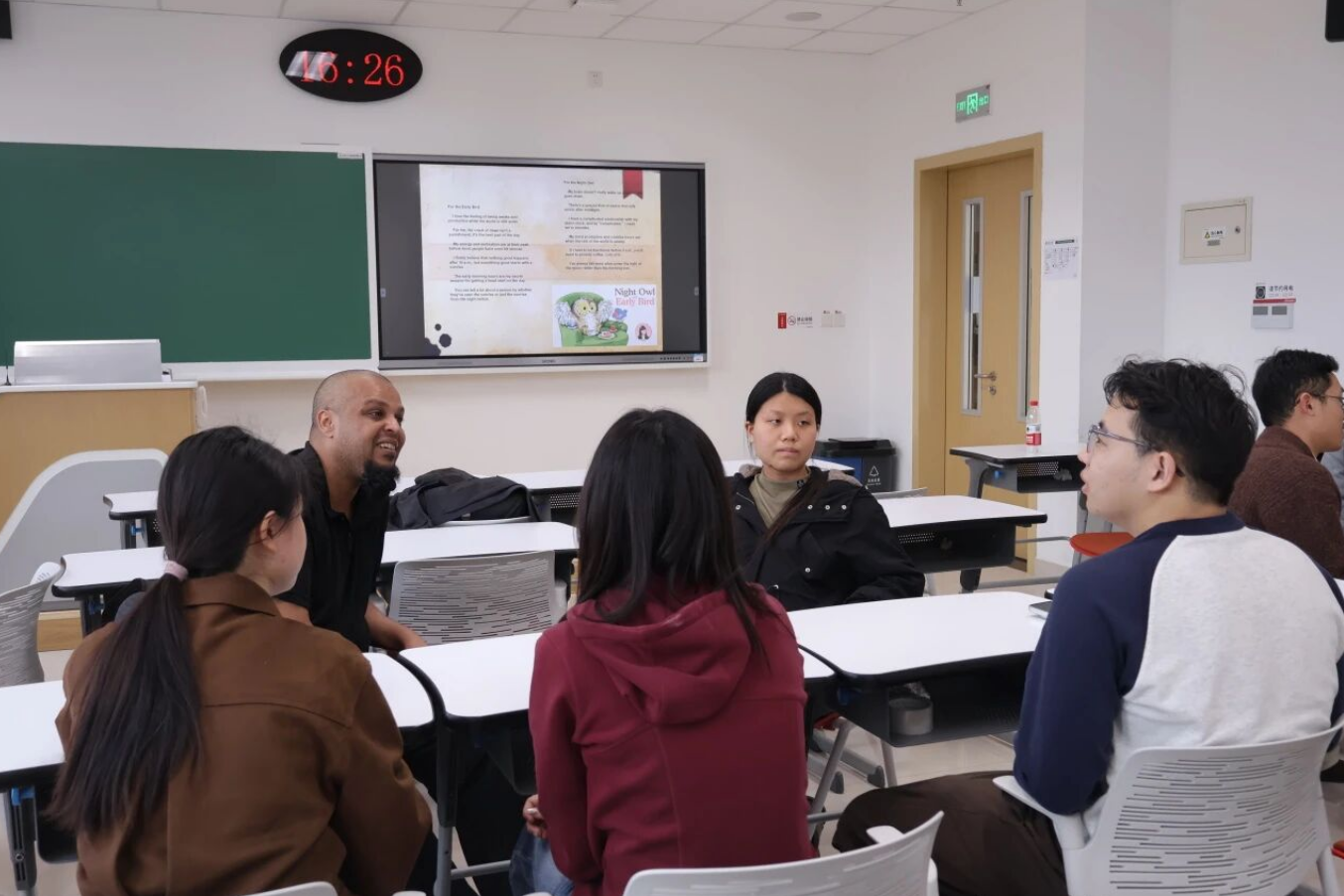Mould老师开场以提问互动的方式引入主题,让同学们分享自己的日常作息。围绕“早起鸟”与“夜猫子”的话题,大家依次讲述了自己一天中最舒适、最自在的时段,现场气氛十分活跃。