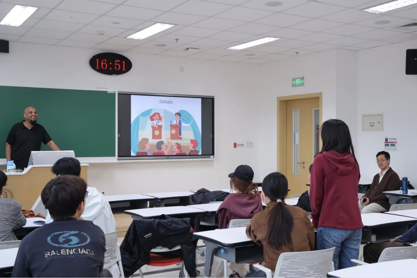 完成讨论后,Mould老师组织三方展开了一场小型辩论:早起鸟组代表分享了清晨高效专注的体验,夜猫子组代表则讲述了夜间灵感活跃的作息特点,混合组同学结合自身经历阐述了灵活作息的适应能力。此外,同学们还各自分享了一天中最舒适的时段——有人偏爱清晨的宁静,有人享受午后的阳光,也有人珍惜晚间放松及与同伴相处的时光。各组围绕作息优劣各抒己见,从学习效率、生活节奏到个人偏好展开交锋,现场笑声与掌声不断,将活动气氛推向高潮。