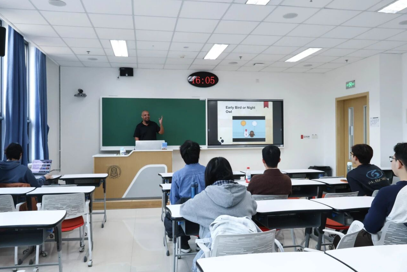 SPEAK UP!讲出你的风采!为提升同学们的英语口语能力,宏德书院与国际教育学院联合推出了“SPEAK UP!”系列活动。3月26日,首期活动在二教D307成功举办,外教Mould,Benjamin Khalid老师以“Early Bird-Night Owl”为主题,带领大家探讨不同作息类型背后的生活与性格。